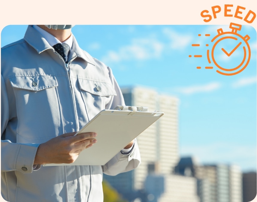 緊急案件や、短納期での完了が必要なお客様はぜひ一度お気軽にお問い合わせください。一般住宅を専門にしていること、地域を限定していること、自社での一貫体制を整えているからこそ可能なスピーディな対応をご提供いたします。